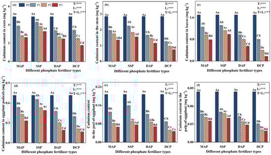 Effect of application of different P fertilizers on cadmium content in various parts of eggplant under cadmium pollution (a): Cd content in roots; (b): Cd content in stems; (c): Cd content in leaves; (d): Cd content in pedicels; (e): Cd content in peel; and (f): Cd content in pulp. Treatments MAP, SSP, DAP, and DCP denote the application of phosphate fertilizer types monoammonium phosphate, superphosphate, diammonium phosphate, and dicalcium phosphate, respectively; and treatments P0, P1, P2, and P3 denote the application of phosphorus fertilizer levels of 0, 0.15, 0.25, and 0.35 mg kg−1, respectively. Upper case letters (A, B, C, D) denote significant differences between different P fertilizer types with the same P fertilizer level, and lower case letters (a, b, c, d) denote significant differences between different P fertilizer levels with the same P fertilizer type. The T and L in each column indicate two-way ANOVA significance levels for P fertilizer type and level. ***, p < 0.01.