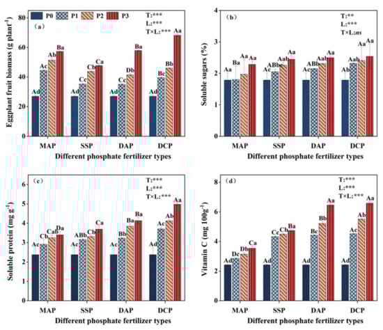Yield and quality indicators of eggplant fruits (a): eggplant yield; (b): soluble sugar; (c): soluble protein; and (d): vitamin C. Treatments MAP, SSP, DAP, and DCP denote the application of phosphate fertilizer types monoammonium phosphate, superphosphate, diammonium phosphate, and dicalcium phosphate, respectively; and treatments P0, P1, P2, and P3 denote the application of phosphate fertilizer levels of 0, 0.15, 0.25, and 0.35 mg kg−1, respectively. Upper case letters (A, B, C, and D) denote significant differences between different P fertilizer types with the same P fertilizer level, and lower case letters (a, b, c, and d) denote significant differences between different P fertilizer levels with the same P fertilizer type. The T and L in each column indicate two-way ANOVA significance levels for P fertilizer type and level. ***, p < 0.01; **, p < 0.05; ns, non-significant.
