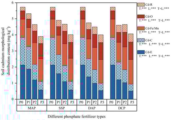 Soil Cd morphology at maturity. The five soil classifications were Cd–E: Cd content in the exchangeable state; Cd–C: Cd content in the carbonate-bound state; Cd–Fe/Mn: Cd content in the Fe–Mn oxide-bound state; Cd–O: Cd content in the organic-bound state; and Cd–R: Cd content in the residual state. Treatments MAP, SSP, DAP, and DCP indicate the application of phosphate fertilizer types monoammonium phosphate, superphosphate, diammonium phosphate, and dicalcium phosphate, respectively. P0, P1, P2, and P3 in the graphs denote the application of phosphate fertilizer levels of 0, 0.15, 0.25, and 0.35 mg kg−1. The T and L in each grading denote the two-way ANOVA significance levels for P fertilizer type and level. ***, p < 0.01.