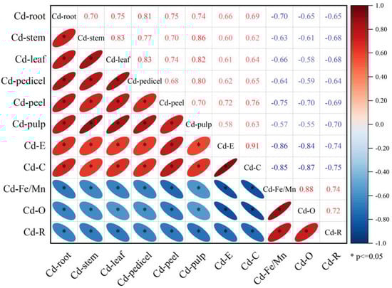 Correlation between soil Cd morphology and Cd content in parts of the eggplants. Cd–E: Cd content in the exchangeable state; Cd–C: Cd content in the carbonate-bound state; Cd–Fe/Mn: Cd content in the Fe–Mn oxide-bound state; Cd–O: Cd content in the organic-bound state; and Cd–R: Cd content in the residual state. Cd–root: Cd content in eggplant root; Cd–stem: Cd content in eggplant stem; Cd–leaf: Cd content in eggplant leaf; Cd–pedicel: Cd content in eggplant pedicel; Cd–peel: Cd content in eggplant peel; and Cd–pulp: Cd content in eggplant pulp. * indicates that the correlation between the corresponding two groups of data is significant (p ≤ 0.05).