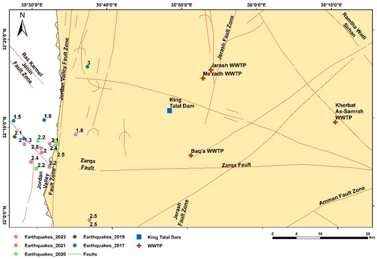 Jordan’s tectonic location is within the boundaries of the northwestern part of the Arabian Plate. The Dead Sea Transform Fault (DSTF) represents the boundary between the Arabian and African Plates. In Jordan, the DSTF consists of two faults: the Jordan Valley Fault on the western side, which extends from the southern corner of the Dead Sea to Lake Tiberias, and the Wadi Araba Fault on the eastern side, which extends from the south of the Dead Sea to the Gulf of Aqaba [24]. Over the last century of monitoring seismic recordings along the DSTF, most of the recorded earthquakes were relatively weak [25]. In the modern era, the most powerful earthquakes were recorded far south of the Dead Sea, for example, those in the Gulf of Aqaba, in 1995, with a Moment Magnitude (Mw) of 7.3 Hz. In 1927, an earthquake was recorded with a Local Magnitude (ML) of 6.2 Hz, with the epicenter near Jericho. Dozens of earthquakes have been recorded along the DSTF with MLs less than 6 Hz during the last three centuries, according to records [26]. Seismic risk in Jordan is associated with the potential for larger, more destructive earthquakes. Jordan’s infrastructure, including dams and buildings, is vulnerable to seismic events and the country’s rapidly growing population adds to this risk. Jordan has established seismic monitoring networks and institutions, such as the Jordan Seismological Observatory, to track and analyze seismic activity. These efforts are crucial for early warnings and preparedness [27,28].