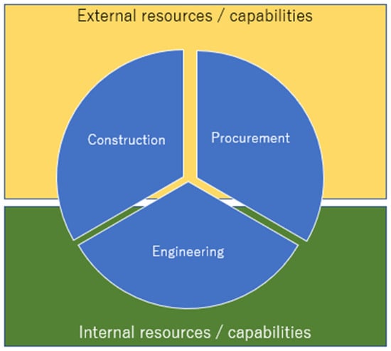 Technical innovation has also been prioritized within companies, which have evolved ecological mindsets through their corporate governance. These types of managerial decisions tend to be favored by stakeholders, influencing aspects such as corporate value. In view of this, each company seeks to identify environmentally friendly business partners with whom to form joint ventures (JVs) and to secure vendors and sub-vendors to procure equipment [4]. Business partners are evaluated and selected using both quantitative and qualitative factors. In the O&G business sector, in response to these developments, environmentally friendly management policies, including engineering, procurement, and construction (EPC) contractors, who build specific plants from the grassroots level, are predominantly in charge of engineering, procurement, and construction, as the abbreviation suggests, and tend to form JV alliances to separate working fields so as to minimize the risk on the execution of each project. This tendency is stronger as scales and project risks increase [5]. Due to the nature of EPC contractors, procurement is often heavily affected by external factors. Yusuf et al. identified that, given that purchased goods and services make up 50 to 70 percent of the potential value of manufacturing companies, a company’s competitive edge is primarily determined by the relationships it develops with outside organizations rather than its own internal skills [6], as detailed in Figure 1.