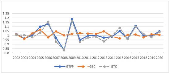 GTFP and its decomposition of dairy industry in China from 2001–2020.