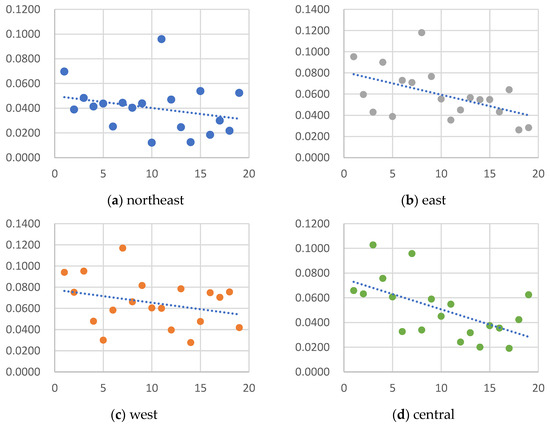 From the perspective of the intra-regional Gini coefficient, the Western region has the largest intra-regional difference, and the average Gini coefficient is 0.654. The Eastern region is the second, and the mean value of the intra-regional difference is 0.0594. The Central region is third, and the mean value of the intra-regional difference is 0.0507. The Northeast region is the lowest, and the mean value of the intra-regional difference is 0.0402. It can be seen that the difference in GTFP growth of the dairy industry in the Western region is the largest, followed by the Eastern and Central regions, and the difference in the Northeast region is small. From the perspective of the changing trend (Figure 2), the Gini coefficients of the GTFP of the dairy cow industry in the four regions in the sample interval show a downward trend, and the decline degree is the highest in the Central region, followed by the Eastern region and the lower in the Northeastern region and the Western region.