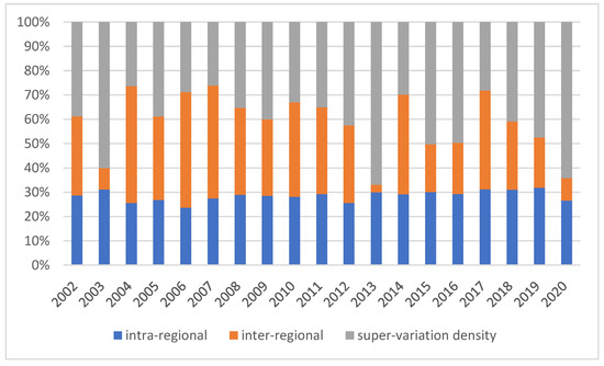 In terms of the contribution rate of Gini coefficient decomposition items to the overall Gini coefficient, super-variation density has the largest contribution rate during the sample period, with an average annual contribution rate of about 41.16% and a contribution rate between 26.09–66.95%. The contribution rate of regional difference was the second, with an average annual contribution rate of 30.27% and a contribution rate between 8.91% and 47.54%. The contribution rate of intra-regional differences is relatively low, with an average annual contribution rate of about 28.56% and the contribution rate ranging from 23.64% to 31.81%. From the perspective of the change trend (Figure 3), during the sample investigation period, the contribution of inter-regional difference and super-variation density varies greatly, while the contribution of intra-regional difference keeps a stable change trend with small fluctuation. The above analysis shows that the main source of regional differences in GTFP of the dairy industry in China is super-variation density; that is, the degree of overlap between different regions, followed by inter-regional differences, and the contribution rate of intra-regional differences to regional differences in GTFP of the dairy industry is relatively small.