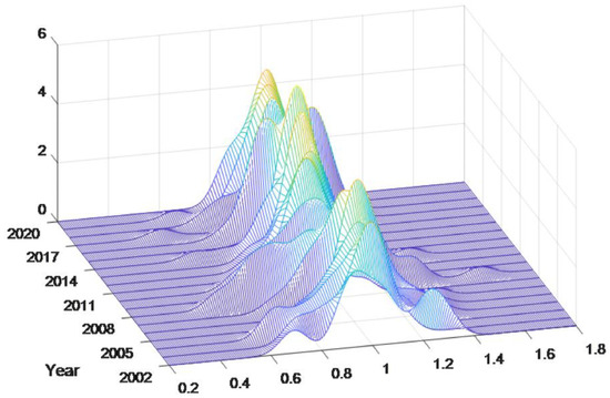 Figure 4 shows the evolution of GTFP in China’s dairy industry from 2001 to 2020. Firstly, from the distribution position, the center of the Kernel density curve moves to the right, indicating that the GTFP of China’s dairy industry has increased. Secondly, from the perspective of distribution pattern, the decrease in peak height in 2008 indicates that the difference degree of GTFP in China’s dairy industry is expanding, indicating that different provinces are affected by the “melamine” event to different degrees. Generally speaking, the peak changes from “flat and wide” to “high and narrow”, indicating that the difference degree of GTFP in China’s dairy industry in all provinces is gradually narrowing. From the perspective of distribution polarization, the distribution of GTFP in the dairy industry changed from multi-peak to bi-peak, and the polarization phenomenon weakened. From the perspective of distribution extensibility, there are different degrees of trailing phenomenon each year, indicating that there are provinces with low and high GTFP in the dairy cow industry in China, indicating that the “catch-up effect” of the low-level provinces on the high-level provinces in the GTFP of the dairy cow industry is insufficient during this period, and the regional difference increases.