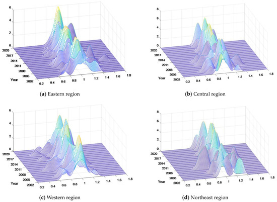 Figure 5a shows the distribution dynamics of GTFP in the dairy industry in the Eastern region. The center of the Kernel density curve experienced a swing change process of “first moving to the left and then moving to the right”, which generally showed a right shift, indicating that the overall GTFP of the dairy industry in the Eastern region was on the rise, and the overall distribution of GTFP of the dairy industry in the Eastern region experienced a development transition process from scattered to concentrated. The phenomenon of right tailing has existed for some years, indicating that there are areas with high dairy GTFP in the eastern region (such as Beijing and Tianjin). (b) shows the evolution of the GTFP of the dairy industry in the Central region. The center of the Kernel density curve moved to the right, indicating that the GTFP of the dairy industry in the Central region increased slightly. The shape of the wave peak gradually narrows from a broad peak to a sharp peak, and the tailing phenomenon gradually weakens, indicating that the GTFP gap of the dairy industry in the Central region is gradually narrowing, and the overall GTFP level of the dairy industry in the Central region is gradually evolving from a dispersed image to a concentrated one, with a value between 0.8 and 1.2. (c) shows the evolution of the GTFP of the dairy industry in the Western region. The center of the Kernel density function shifted to the left, indicating that the GTFP of the dairy industry in the Western region had decreased. The peak mainly showed a “multi-peak” distribution, and the side peak was significantly lower than the main peak, indicating that the GTFP of the dairy cow industry in Western China was polarized, and the absolute difference was expanding. The distribution curve has a right trailing and gradually broadens, indicating that the GTFP difference of the dairy industry in the Western region is gradually expanding. (d) shows the evolution of the GTFP of the dairy industry in Northeast China. From the perspective of time, it can be divided into two parts. The first half of the distribution is mainly multi-peak with polarization phenomenon. In the second half of the investigation period, the distribution form is changed from multi-peak to single peak, and the polarization phenomenon is weakened.