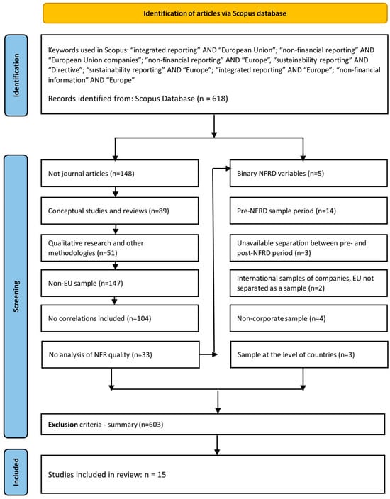 The first stage of conducting the systematic review involves the extraction and selection of articles from the Scopus database. To identify relevant articles, we use the following combined keywords in successive searches: “integrated reporting” AND “European Union”; “non-financial reporting” AND “European Union companies”; “non-financial reporting” AND “Europe”, “sustainability reporting” AND “Directive”; “sustainability reporting” AND “Europe”; “integrated reporting” AND “Europe”; “non-financial information” AND “Europe”. Articles in languages other than English were also excluded using the automated filters in Scopus. All identified records, for 2016–2023, were downloaded in Excel files, the unique field being the digital object identifier (DOI). The date of database access and download was 12 April 2023. Duplicates were removed using Excel functions. The results comprise 618 articles (published between 2017 and 2023) that are subject to further screening.