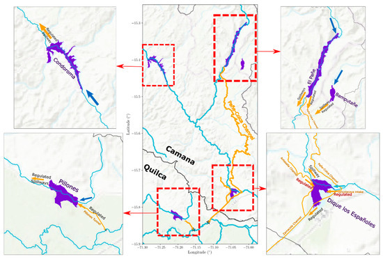Figure 2. Distribution of flows for the “Condoroma”, “Pillones”, “Bamputañe”, “El Pañe”, and “Dique los Españoles” reservoirs, with blue arrows representing flows related to hydraulic infrastructure and blue lines denote flows produced by natural drainage. The regulated label means scheduled releases by the operators; spillway label refers to spillway flows; and regulated labels in red represent scheduled flows not recorded by the operators (without time series).