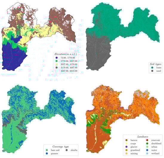 The watershed and land-use delineation required processing of data, so this task is presented in Results, rather than in Methods. The main variables required for the model were elevation, soil type, coverage type, and land use for each HRU, which were defined from the land use data geometries. Soil type was not considered for delineating the HRUs since the datasets found had numerous uncertainties and there were no related comprehensive studies. An example of the distribution of some input variables for simulating one of the watersheds is illustrated in Figure 3.