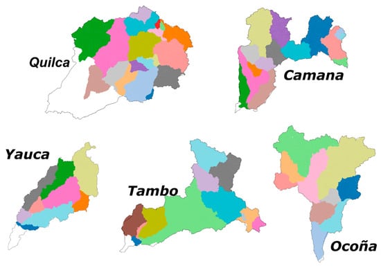 The delineation of basins and subbasins considered drainage points, where stream gages, diversions, or reservoirs were present. Most of the watersheds had missing areas in the lowest parts of the basins since there are no gages in those places except for the Camana and Ocoña watersheds, which have main cities surrounded by agriculture in those areas. There were at least nine subbasins in each watershed (Figure 4), where the basins with “Cuenca” or “basin” as a prefix in the legend are subbasins found in the National Water Authority (ANA) repositories.