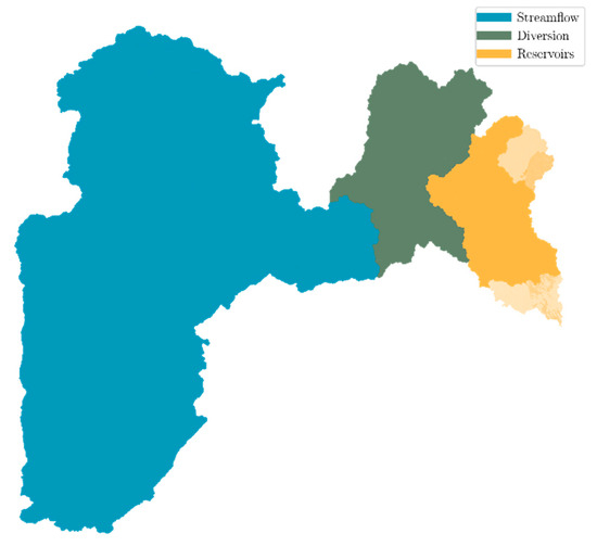 - When analyzing the simulation setup, it is important to differentiate between drainage areas dominated by streamflows, diversions, and reservoirs (see Figure 5). In the case of drainage areas with reservoirs, a simulation was needed for each, though PRMS allows the simulation of up to four reservoirs at once. One subbasin was needed for each diversion since water transfers were implemented to the entire subbasin and taken out of the resulting subbasin outflow. For the case of streamflow, all could be simulated at once and there was no need to split the simulation based on the number of stream gages, as illustrated in Figure 5.