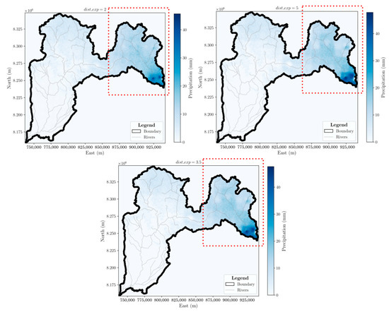 - To speed up the simulations, climate files for each one of the five watersheds were created. Three main variables are dominant in the inverse distance-elevation weighting (IDE) method of PRMS, from which two main variables were adjusted. The first variable (“dist_exp”) is the most important since it provides more weight in the spatial distribution for a certain weather station, while the second one (“prcp_wght_dist”) is a ratio to adjust more weight to distance or elevation, from which 75% percent of weight was given to distance and 25% to elevation. The problem with elevation was the drastic changes in the characteristic topography of the Peruvian Andes, which caused a lot of “noise” in the distribution. To test the first variable, a gridded HRU approach was applied to smooth the distribution of the climate variables. The gridded approach allows seeing a proper distribution of the climate variables compared to the semi-distributed one that is used for the models. The “dist_exp” variable is highly sensitive (i.e., the higher its value, the more influence the weather stations will have in nearby cells). Many values were tested for this parameter and a value of 3.5 was chosen since it smooths the distributions best (see Figure 6). The same values were applied to the five watersheds and Climate by HRU (CBH) files were created.