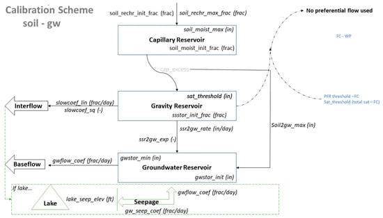 The main runoff-related variable adjusted was “carea_max” (see SI 3), which specifies the percentage of the HRU that produces runoff. The other main variables represent the region between the soil zone and groundwater, which were the most complex. The soil zone included a capillary reservoir (amount of water held in soil moisture), gravity (mobile in the soil zone), and preferential flow (PFR) storage (not included). Hence, after getting familiar with each watershed and how water is managed on them, a conceptual map (see Figure 7) for these storages was prepared to guide the calibration.