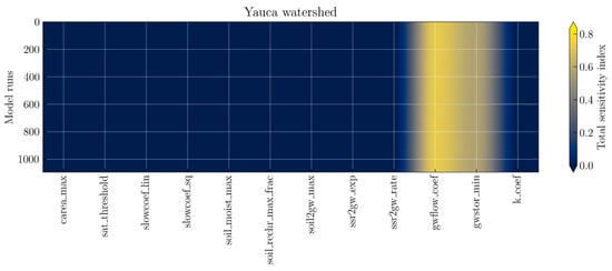 The sensitivity analysis varied depending on the target observation and subbasin. Evaporation rates were not analyzed for sensitivity since one variable was available to adjust. Moreover, a critical factor for the sensitivity results was the boundaries applied to each sensitivity analysis. Overall, the model output was most sensitive groundwater parameters. Figure 8 shows an example of a sensitivity analysis where the metric to be evaluated was the total sensitivity index, with the model output being most sensitive to “gwflow_coef” and “gwstor_min” (the first parameter adjusts the baseflow rates and the second one adjusts the minimum groundwater storage to be preserved in the subbasin).