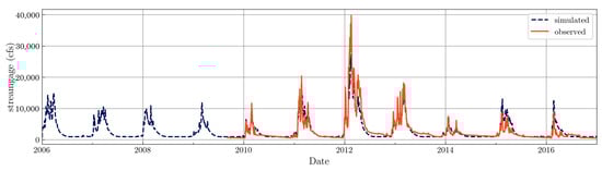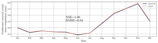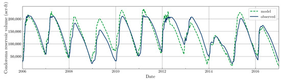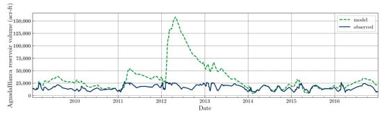 The time series for each observed dataset was calibrated. Figure 9, Figure 10 and Figure 11 represent examples of calibrated time series for evaporation, reservoir volumes, and streamflow, respectively. Reservoir volumes and streamflows are in English units since it is the default model output for PRMS, as previously mentioned. Moreover, evaporation calibrations got Nash–Sutcliffe Efficiency (NSE) greater than one and very low Root Mean Squared Error (RMSE) since the calibration was performed based on monthly means and there was only a need to adjust one evaporation parameter for each month. A complete view of all calibrated datasets for reservoir evaporation, reservoir volumes, and streamflows are shown in SI 4, SI 5, and SI 6, respectively.