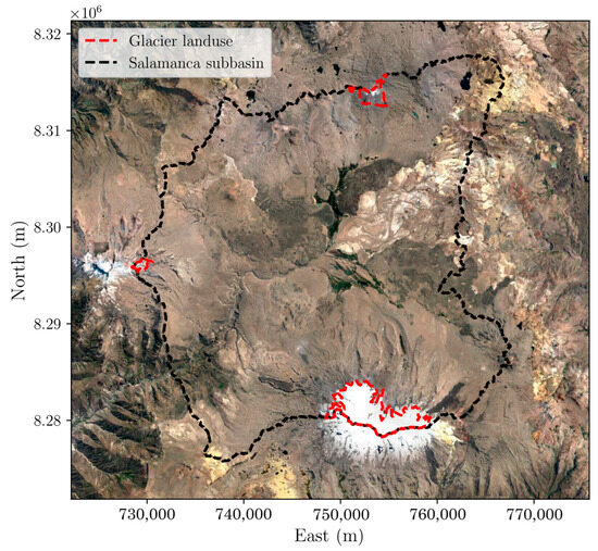 - The Salamanca subbasin, located in the Ocoña watershed, from which an NSE of 0.35 was obtained, though only a small percentage of importance was associated with the main stream gage. There was not enough data to catch the dry seasons and, more importantly, different baseflow magnitudes during the dry seasons. The hypothesis associated with this is that this stream gage is located downstream of a glacier (see Figure 12), which by having different melting periods is changing this dynamic. Moreover, some previous studies (e.g., [34]) have tried to calibrate this stream gage but were not successful and lesser performance (NSE = 0.20). A study developed by ANA had better results but the simulation was developed on a monthly basis [22].