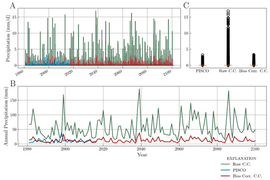 Precipitation bias correction for one grid cell location of the SSP 126, with (A) showing the time series, (B) representing the annual precipitation, and (C) illustrating a box plot for each dataset used and corrected.