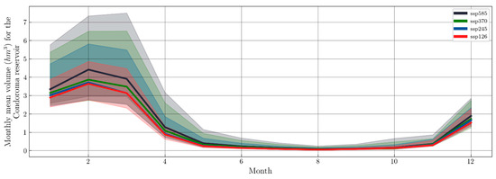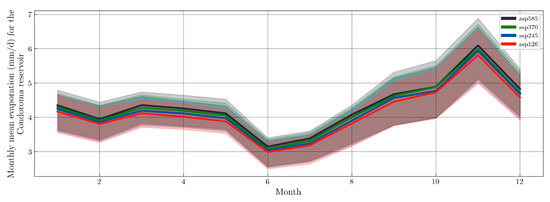Example of monthly mean evaporation for the Condoroma reservoir considering different SSPs.
