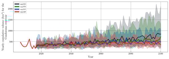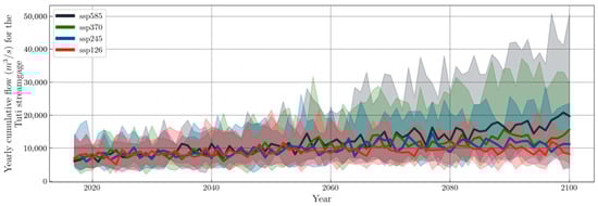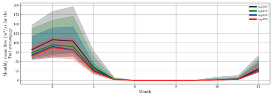 In summary, the models predict an overall increase in precipitation and temperature within the study area, with this increase being directly related to the severity of SSPs, agreeing with the findings by other authors (e.g., [35]). With this preliminary analysis in mind, each previously simulated set of subbasins was computed using the future climate change datasets. As previously mentioned, three different analyses were performed, and similar characteristics were found through all simulations for each evaluation. Examples for each analysis were developed for monthly means and yearly cumulative rates, where lines denote the mean of the ensembles represented by bands for each SSP (see Figure 15, Figure 16, Figure 17, Figure 18, Figure 19 and Figure 20). The means were used as a reference since there is a lot of uncertainty among climate change models.