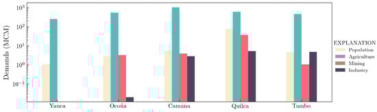 From the calculated relationships, it can be seen that: (1) for the Ocoña watershed, the Salamanca stream gage does not have an important contribution and the main gage is the Ocoña station; (2) for the Camana watershed, the three upstream reservoirs are only contributing spillway flows to the Condoroma reservoir, and it is mainly used to supply flows for the Tuti diversion. Moreover, a big gap between the Tuti and Huatipa stations was detected, from where the Condoroma reservoir and the Tuti diversion characterize the overall diversion/reservoir infrastructure of the regulated part of this watershed, and the Huatipa and Hacienda Pampata stations represent the unregulated part of the watershed, being the Huatipa station the most important since it catches the flows of the drainage areas that supply most of the water; and (3) for the Quilca watershed, the Pañe reservoir from the Camana watershed supplies most of the water through the Zamacola channel. Similarly, this channel supplies most of the water to the Aguada Blanca reservoir compared to the other three reservoirs that this watershed has (El Frayle, Pillones, and Challhuanca). The Aguada Blanca reservoir is the most important one (in terms of surface outflows) since it regulates the Arequipa city water supply. Moreover, the Puente del Diablo station is located downstream from this reservoir and almost at the southernmost point of the city. For this station, the most important contribution is given by the Aguada Blanca reservoir outflows.
