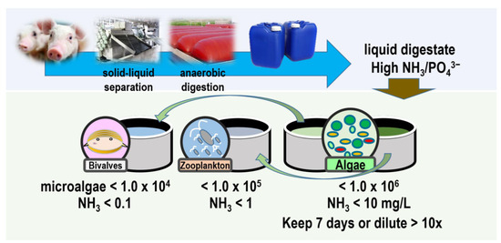 - Zhou, J.; Wu, Y.; Pan, J.; Zhang, Y.; Liu, Z.; Lu, H.; Duan, N. Pretreatment of Pig Manure Liquid Digestate for Microalgae Cultivation via Innovative Flocculation-Biological Contact Oxidation Approach. Sci. Total Environ. 2019, 694, 133720. [Google Scholar] [CrossRef] [PubMed]