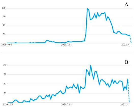 Metaverse queries via Google Trends from 2020 to present: (A) world; (B) South Korea.