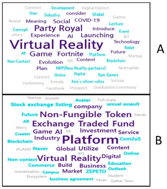 The top 50 keywords are listed in Table 4. In 2020, the keyword with the highest frequency is “Virtual reality” (1832 times), followed by “Party Royale” (986 times), “Games” (708 times), “Fortnite” (563 times), “Launch” (513 times), and “Social” (440 times). In 2021, the keywords with the highest frequency appearance were “Platform” (897 times), “Virtual reality” (534 times), “NFT” (531 times), “ETF (Exchange Trade Fund)” (526 times), “AI” (336 times), and “Game” (322 times).