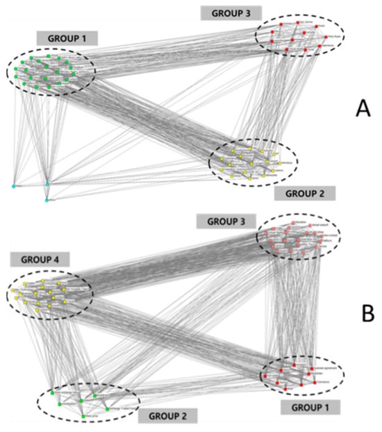 Visualization of CONCOR analysis for the years 2020 (A) and 2021 (B).