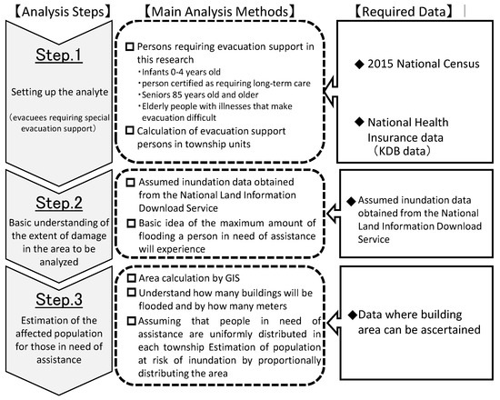 In this study, as shown in the analysis flow in Figure 1, we first defined the vulnerable people and understood their needs on a town district basis. Subsequently, using the assumed flood area map obtained from the Digital National Land Information Download Service [11], a preliminary estimate of the number of vulnerable people who may be affected by floods was conducted by apportioning the area using the building area. In this paper, we used the assumed flood area map without considering specific levee breakage points because the purpose of this study was to understand, in advance, the disaster risk (flooding risk) that vulnerable people may suffer. The results obtained in this study aim to make citizens aware of the disaster risk to vulnerable people; thus, we used an assumed flood area map, which can be said to reflect the largest possible case of flooding.