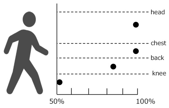 Additionally, the flood depth and approximate extent of flooding (building height) according to the Ministry of Land, Infrastructure, Transport and Tourism’s river disaster prevention information [20] are shown in Table 1. Based on this information, the flood depth and extent of flooding are presented in the hazard map [21] published by Komatsu City, as shown in Figure 4. Furthermore, according to Suetsugi [22], Figure 5 shows the flood height and proportion of people who have difficulty evacuating. As evident, most people found it difficult to evacuate when the floo depth reached knee depth (approximately 0.5 cm) or more.