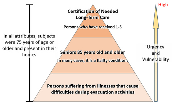 The subjects in the present study were vulnerable people according to specific attributes, such as infants, people aged 75 years or older who are certified as in need of long-term care, people aged 85 years or older, and people with illnesses that render evacuation actions difficult. The previous research mentioned in Section 2.1 and Section 2.2 did not consider the detailed attributes of the subjects when estimating evacuation behavior, actual damage status, and damage. It is believed that there is a major element of novelty in the present study owing to the conduction of a detailed analysis of the attributes of aged people in particular. Although it is certain that infants have difficulty evacuating on their own, there is a wide disparity with the physical condition of people aged 65 years and over, and it is thought that all aged people should not be judged as finding it difficult to evacuate on their own. A 65-year-old person who has been certified as in need of long-term care level 5 should not be considered as being in the same position as a 65-year-old person who is physically and mentally healthy during an evacuation. In the present study, subjects were narrowed down to “aged persons” and “infants” as a broad framework; however, among these subjects, those who definitely find it difficult to evacuate were targeted based on their specific attribute. Thus, the narrowing down of vulnerable people was conducted in a precise manner.
