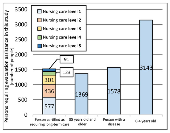The calculations of vulnerable people, with a focus on the “infants” and “aged people” described in the previous section, were conducted using the KDB data and National Census. The target population was calculated on a town district basis; however, there were 126 target town districts, and it was difficult to list all of them. Thus, in this section, the calculation results for the 126 target town districts are shown in summarized form in Figure 7. The number of people in need of long-term care 1–5 was 1528 (long-term care level 1: 577 people; long-term care level 2: 436 people; long-term care level 3: 301 people; long-term care level 4: 123 people; and long-term care level 5: 91 people), the number of aged persons aged 85 years or older was 1369, the number of people with the diseases shown in Table 4 was 1578, and the number of infants aged 0–4 years was 3143 in the 126 target town districts. These people were located in towns within the assumed flood area of the Kakehashi River system, and as the number of people who were not hospitalized or were not admitted to nursing care facilities was calculated, it was considered that there is an extremely high possibility that these people resided at home.