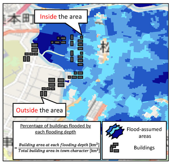 First, we discuss the calculation method used to estimate the flood risk, which represents the greatest risk for people in need of special consideration. In the previous section, it was considered that the vulnerable people analyzed in the present study are not hospitalized or admitted to facilities and are considered to have more difficulty moving around independently than in normal times, making it highly likely that they would be present at home in the event of a disaster. Therefore, when estimating the affected population, we decided to use area apportionment using the building area to estimate how many people would be affected by floods and to what extent. In this analysis, building polygon data were obtained using data sold by Esri Japan [25]. These data contain building types, and commercial facilities, hotels, public facilities, and houses can be identified. From these categories, we extracted the building polygon data using only the “Houses” category. Figure 8 shows a diagram of area apportionment when estimating the affected population. When calculating the affected population for each flood depth, the extent of flooding that buildings in each town district experience (“building flood rate”) was calculated on a town district basis for each assumed flood depth. The building flood rate for each flood depth that was calculated for each town district was then multiplied by the number of vulnerable people calculated on a town district basis to obtain the affected population for each flood depth.