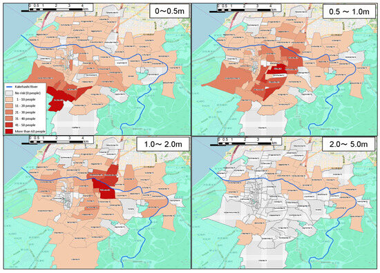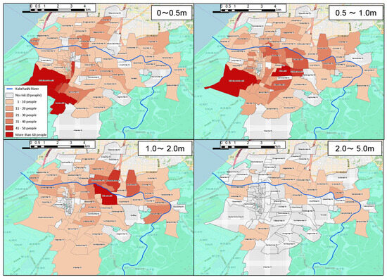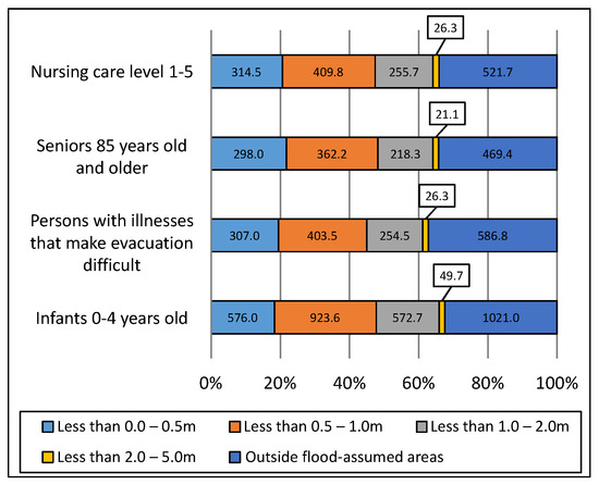 Figure 9 shows the population by attribute for each flood depth in the entire analyzed town district area as a basic understanding of the affected population. It is possible to understand from Figure 9 how many vulnerable people by attribute would be affected by flooding and to what extent. Across all four attributes, approximately 65% of those in need of support are affected by flooding, and approximately 35% are not. Additionally, in the analysis conducted in the present study, the deepest assumed flood classification was “less than 2–5 m”. The number of people who were estimated to live in those areas according to attribute was as follows: those certified as in need of long-term care were approximately 26.3 people (approximately 1.7% of the proportion of all people certified as in need of long-term care); people aged 85 years and older were approximately 21.1 people (approximately 1.5% of the proportion of all persons aged 85 years and older); those with diseases that were considered to make evacuation actions difficult were approximately 26.3 people (approximately 1.8%); and those aged 0–4 years were approximately 49.7 people (approximately 1.6%). Furthermore, as shown in Figure 5, when the flood depth exceeded 0.5 m, most people found it difficult to evacuate. The number of people when evacuation was thought to become sufficiently difficult as the flood depth exceeded 0.5 m was as follows: those certified as in need of long-term care were approximately 691.7 people (45.3%); people aged 85 years and older were approximately 601.6 people (approximately 43.9%); those with diseases that were considered to make evacuation actions difficult were approximately 684.2 people (approximately 43.4%); and those aged 0–4 years were approximately 1546 people (approximately 49.2%). Moreover, it is highly likely that those affected by a flood depth ranging from 0 to less than 0.5 m may have difficulty in evacuating.