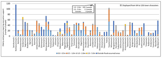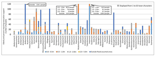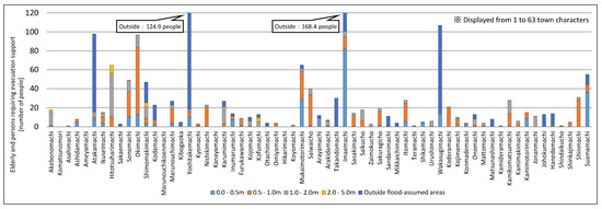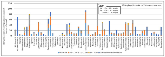 For example, as with the analysis results for aged people, using Oki Town as an example, the flood risk was evident for approximately 12.9 people at a flood depth of 0–0.5 m, approximately 70.9 people at a flood depth of 0.5–1.0 m, approximately 18.2 people at a flood depth of 1.0–2.0 m, 0 people at a flood depth of 2.0–5.0 m, and 0 people outside of the assumed flood area. Figure 10, Figure 11, Figure 12 and Figure 13 show the variations in the population within each town district, and the assumed range of flooding within the town district also differed. Thus, there were naturally large variations in the number of people in need of support as obtained by the estimations. In Figure 10, Figure 11, Figure 12 and Figure 13, the vertical axis (number of people in need of support) was limited to 120 (people) to render it easier to observe the number of people facing a flood risk for each town district. Town districts exceeding 120 people are indicated in the figure. These results show that the estimations conducted in the study facilitated the estimation of the populations facing a flood risk in detail on a town district basis, with a focus on aged people by attribute and infants among vulnerable people.