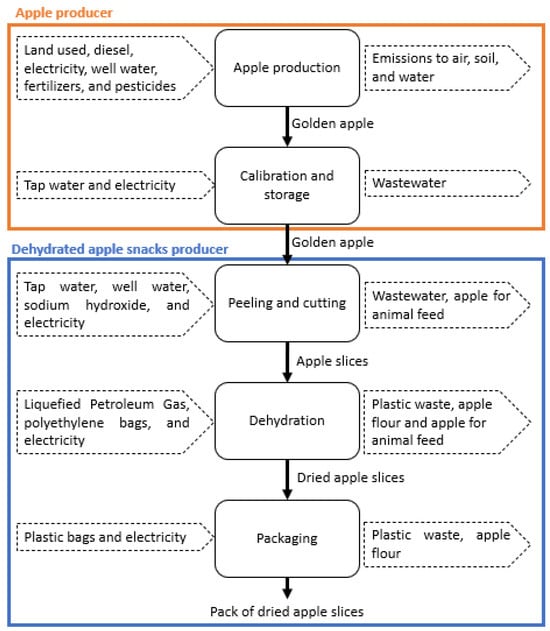 Our review shows that there are not yet available LCA studies of dried apples using a “cradle to gate” approach or an LCA focusing on the impact of the hot hair drying method, which is known to be the most common method used to dehydrate food worldwide [5]. The present study aims to fill this gap by assessing the environmental impacts of dehydrated apple snacks with a “cradle to gate” approach, using mainly primary data collected from two Portuguese companies, one owning apple orchards and the other producing dehydrated apple snacks through hot air drying. The purpose is to perform a Life Cycle Assessment of dehydrated Golden Delicious apple slices to identify the contribution of the production processes and life stages to the overall environmental impacts. Even though several varieties of apples are produced, the Golden Delicious apple variety accounts for 70% of the apples used by the company to produce dried snacks. Data for the agricultural processes are from a Portuguese company from the Beira-Alta region, with 44 ha of apple orchards. The apple snack production data are from one of Portugal’s main producers of dehydrated fruits. This company currently exports about 40% of its production and, at the beginning of 2022, its brand had a share of 50% of the dried fruit sold in Portugal [29].
