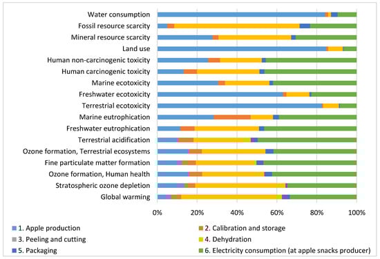 Figure 2 shows the activities’ contributions for the 17 environmental impact categories assessed. The peeling and cutting stage (represented with the grey color) has a negligible contribution to all the impact categories assessed (less than 1%) and thus not visible in Figure 2. The absolute values and percentage of the contributions are shown in the Supplementary Material (Table S1). Overall, the electricity consumption (at the apple snacks producer) is the activity with the largest contribution to the majority of the impact categories. The results show a larger contribution to nine categories (varying from 39% to 50%). Then, the dehydration and apple production stages are shown to have the larger contribution to four categories. The contribution ranges from 37% to 63% for dehydration and from 63% to 85% for apple production. Apple production stands out with a contribution of over 80% for three impact categories (water consumption, land use, and terrestrial ecotoxicity). Each life-cycle stage is assessed in more detail below, from the most significant contributors to the less.