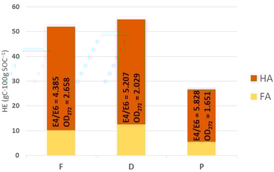 Concentrations and spectroscopic parameters of humic extract (HE) from reforested (F), deforested (D), and peatland (P) soils. OD272: Optical density at 272 nm. E4/E6: Ratio between optical densities at 465 and 665 nm.