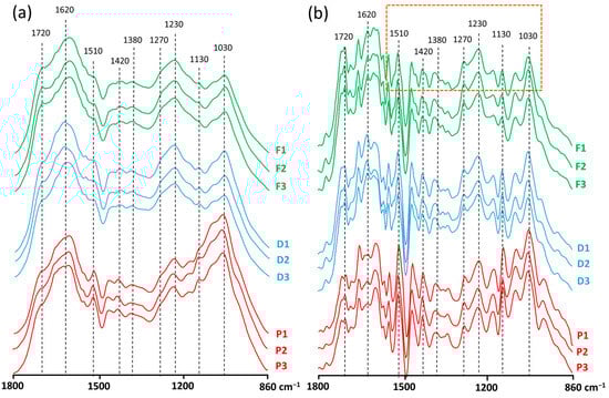Infrared spectra of purified humic acid (HA) extracted from reforested soil (F in green), deforested soil (D, blue), and peatland (P, red). (a) Original spectra. (b) Resolution-enhanced spectra. The box with a dashed line indicates the region with bands characteristic of lignin.