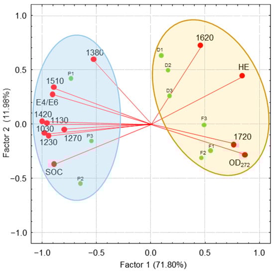 Biplot obtained through principal component analysis; soil samples are represented with green circles: reforested soil (F), deforested soil (D), and peatland (P). Variables used to perform the PCA are represented with red circles: SOC, E4/E6, HE, OD272, and the wavenumbers in the infrared spectra (1720, 1620, 1510, 1420, 1380, 1270, 1230, 1130 and 1030 cm−1). The biplot suggests two main clusters: the first embraces variables related to well-transformed organic matter (yellow cluster), while the second (blue cluster) includes variables associated with relatively more fresh organic matter.