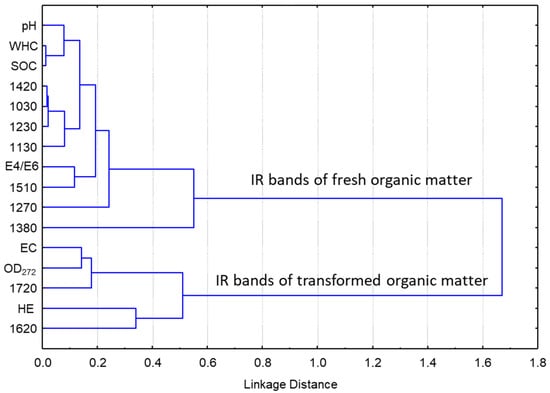 The cluster analysis results are consistent with those obtained through the PCA (Figure 5). Two main clusters are distinguished by their IR bands; one comprises the bands associated with the lignin structure, while the other is characterized by carboxyl and aromatic structures. The SOC content shows an outstanding correlation with both WHC and pH, and all of these variables are correlated with the IR bands at 1510, 1420, 1380, 1270, 1230, 1130 and 1030 cm−1 (bands associated with the lignin pattern) and the E4/E6 ratio. The EC, OD272, and HE content correlate well with the 1720 and 1620 cm−1 bands, which are associated with the more transformed SOM.