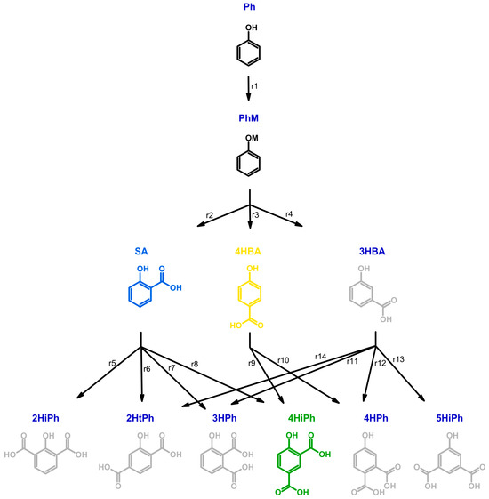 All the precursors, reactants, and gases have been purchased from commercial suppliers and used as is, without any further purification. Isopropanol (≥99.5%, Merck KGaA, Darmstadt, Germany, reference number 107022511), tetrahydrofuran (>95 wt.%, EMD Millipore, Burlington, MA, USA), and toluene (≥99.9%, Merck Emsure KGaA, Darmstadt, Germany, LOT#: K52240225013) were used as solvents, while carbon dioxide (2.2, Messer, Bad Soden am Taunus, Germany) was used as reaction gas. For the preparation of metal phenoxides, four different bases were used: sodium hydroxide (≥98%, pellets (anhydrous), Honeywell Fluka, Charlotte, NC, USA, LOT#: J3260), potassium hydroxide (≥85%, pellets, Honeywell Fluka, Charlotte, NC, USA, LOT#: K0410), sodium carbonate (≥99.5%, anhydrous, Honeywell Fluka, Charlotte, NC, USA, LOT#: J1110), and potassium carbonate (99%, anhydrous, Alfa Aesar, Ward Hill, MA, USA), which were reacted with phenol (99.5%, Acros Organics, Fair Lawn, NJ, USA, LOT#: A0411827), while commercial sodium phenoxide (98%, Alfa Aesar, Ward Hill, MA, USA, LOT#: N06G041) was used as is. For calibration curves used in the high performance liquid chromatography (HPLC), various potential phenolic carbonates were obtained: salicylic acid (SA) (≥99.0%, Sigma-Aldrich, St. Louis, MO, USA, LOT#: MKCK6947), 3-hydroxybenzoic acid (3HBA) (99%, Sigma Aldrich, St. Louis, MO, USA, LOT#: BCCB1724), 4-hydroxybenzoic acid (4HBA) (≥99%, Sigma Aldrich, St. Louis, MO, USA, LOT#: BCCB8991), 2-hydroxyterephthalic acid (2HtPh) (97%, Sigma Aldrich, St. Louis, MO, USA), 4-hydroxyisophthalic acid (4HiPh) (>98.0%, TCI Tokyo Chemical Industry, Tokyo, Japan, LOT#: 7RFGK-MQ), 5-hydroxyisophthalic acid (5HiPh) (99%, Acros Organics, Fair Lawn, NJ, USA), 4-hydroxyphthalic acid (4HPh) (>98.0%, TCI Tokyo Chemical Industry, Tokyo, Japan, LOT#: NBX5C-OA). In-house distilled water was used together with formic acid (98%, Sigma Aldrich, St. Louis, MO, USA) as an internal standard for dissolving the obtained solid products and diluting the liquid samples for the HPLC analysis.
