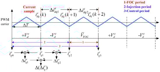 Current or voltage injection estimation is a technique used in the control and estimation of PMSMs. In this method, a current signal is injected into the motor windings, and the resulting motor response is analyzed to estimate various parameters, including rotor position and speed, stator resistance, and the states of the motor. In this method, a current waveform with known frequency and amplitude is injected into one or more phases of the motor’s stator windings. This injected current perturbs the motor’s operation and generates a response in the form of back-EMF and variations in current and voltage. After carefully measuring and analyzing the response of the injected current, the current and voltage signal variations and their phase relationships can be obtained. The current injection estimation provides a non-invasive and efficient method, which is particularly valuable for predictive maintenance, enabling early fault detection and assessment without the need for motor disassembly, and is beneficial in optimizing maintenance schedules, reducing downtime, and improving the overall reliability and efficiency of PMSMs. It can also be implemented during normal motor operation, making it suitable for online parameter identification and control adjustments. By accurately estimating rotor position and speed, this sensorless control method can operate PMSMs without relying on costly and failure-prone position sensors [21].