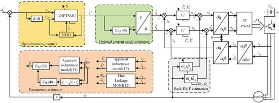 To overcome the challenges posed by magnetic saturation effects, which is defined as the critical point where the magnetic flux density of the magnets or the iron core in the stator no longer increase with an increase in the magnetizing force, and as the lack of a maximum-torque-per-ampere-control guideline with unmodeled dynamic compensation based on an online excitation level calculation in synchronous reluctance motors, an adaptive non-singular terminal sliding mode control scheme was developed to face the highly nonlinear and time-varying parameters. Figure 5 shows the control block diagram of the proposed method. It shows the speed tracking, current regulators, optimal current angle estimator, and parameter estimator. It can be claimed that the main contributions of this method are that it can effectively track MTPA operating points, solve the reference current distribution problem under the influence of nonlinear and time-varying parameters, and reach the goal of shortening the time to reach the sliding mode surface and reducing chatter (undesired high-frequency oscillations) near the surface. The experimental results demonstrated that this control strategy achieves satisfactory dynamic performance and robustness, despite the nonlinearities and time-varying parameters [26].