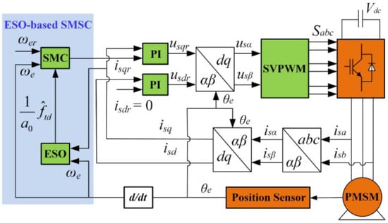 To enhance the tracking performance of speed controllers in PMSM drive systems, an extended-state observer-based sliding mode observer was designed to handle various disturbances in real-time, including internal parameter variations and external load changes, based on an upper bound estimate of the total disturbance. Through this method, the extended state observer’s parameters could be configured according to the desired bandwidth of the observer, and the estimated total disturbance obtained from the observer was used to continuously update the control law in real-time. The results indicated an improved speed-tracking performance and robustness against disturbances without sacrificing the fast dynamic response. The stability of the closed-loop PMSM drive system with the proposed control is rigorously demonstrated through Lyapunov theory. Experimental results from a 200 W salient pole PMSM drive system confirm the practical efficiency of this strategy [28]. Similarly, another study introduces an active disturbance rejection-based sliding-mode current control to enhance the tracking performance of current controllers in PMSM drive systems when facing internal disturbances. The schematic demonstration is shown in Figure 6. The results indicated that the current controller can significantly improve both steady-state and transient current tracking performance, along with reinforcing the robustness to internal disturbances [29].