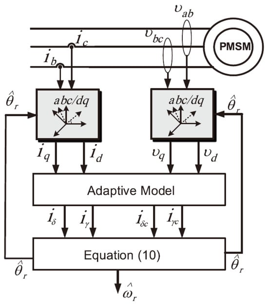 To monitor the position and speed of a PMSM, an MRAS approach was developed by considering the error between actual and estimated rotor position values. A state equation for the PMSM was formulated within the synchronous d-q reference frame. This frame relies on the estimated speed and the nominal parameters of the PMSM. Figure 8 presents the scheme of the block diagrams of the sensorless control system. The primary contribution of this approach is the MRAS adaptation scheme, which aims to estimate the rotor position and speed while minimizing the errors between the derivatives of d-q axis currents of the real system and the model system. Experimental results demonstrate strong performance and accurate speed-tracking capabilities when compared to the sliding mode observer under various speed and load torque conditions [35].