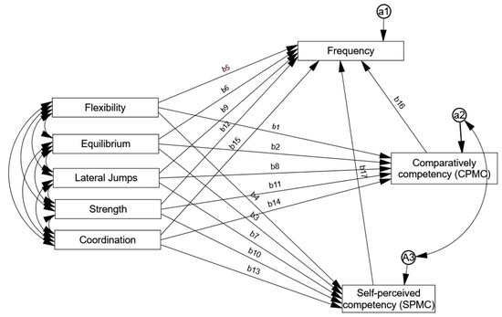This model explains 19.9% of the variance in PA in boys and 24.2% in girls. It explains 8.2% of the variance of self-perceived motor competence (SPMC) in boys and 7.9% thereof in girls as well as 9.4% of comparatively perceived motor competence (CPMC) in boys and 6.9% thereof in girls. This final model underscores the fact that, in both boys and girls, self-perceived motor competence (β15 boys = 0.210; β15 girls = 0.207) and comparatively perceived motor competence (β14 boys = 0.251; β14 girls = 0.231) play a substantial role in PA. A third variable, coordination, also exerts a substantial weight in predicting PA (βboys = 0.049; β13 girls = 0.198): as mentioned above, its weight is statistically more pronounced in the case of girls than in boys. In other words, coordination is more relevant for girls in the frequency of PA than for boys.