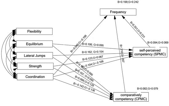 The configuration of the model shows that three of the MC indicators (Lateral Jumps, Equilibrium, and Strength) are only related to SPMC and are not directly related to the frequency of PA: thus, in such cases, an exclusively mediating relationship must be assumed. The mediating role of Coordination would be partial since, as mentioned above, that variable has a direct relationship with the frequency of PA and has different weights in girls than in boys. Nonetheless, an analysis of indirect relationships allows us to estimate the indirect contribution of the MC indicators to the frequency of PA: the most relevant predictor is Lateral Jumps (indirect effect: Boys = 0.063, Girls = 0.055), followed by Equilibrium (Boys = 0.051; Girls = 0.042) and Strength (Boys = 0.049; Girls = 0.042). Still, the most relevant motor competence in PA is Coordination, particularly in girls, in whom we have seen that the direct effect is substantial (Girls: total effect = −0.251, direct effect = −0.198, indirect effect = 0.042; Boys: total effect = −0.105, direct effect = −0.049; indirect effect = −0.056).