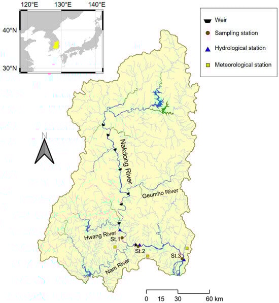 The Nakdong River, the second largest river in the nation, has a length of 511 km and a catchment area of 23,690 km2 (Figure 1). The river has a typical temperate monsoon climate, with a mean annual precipitation of approximately 1500 mm.